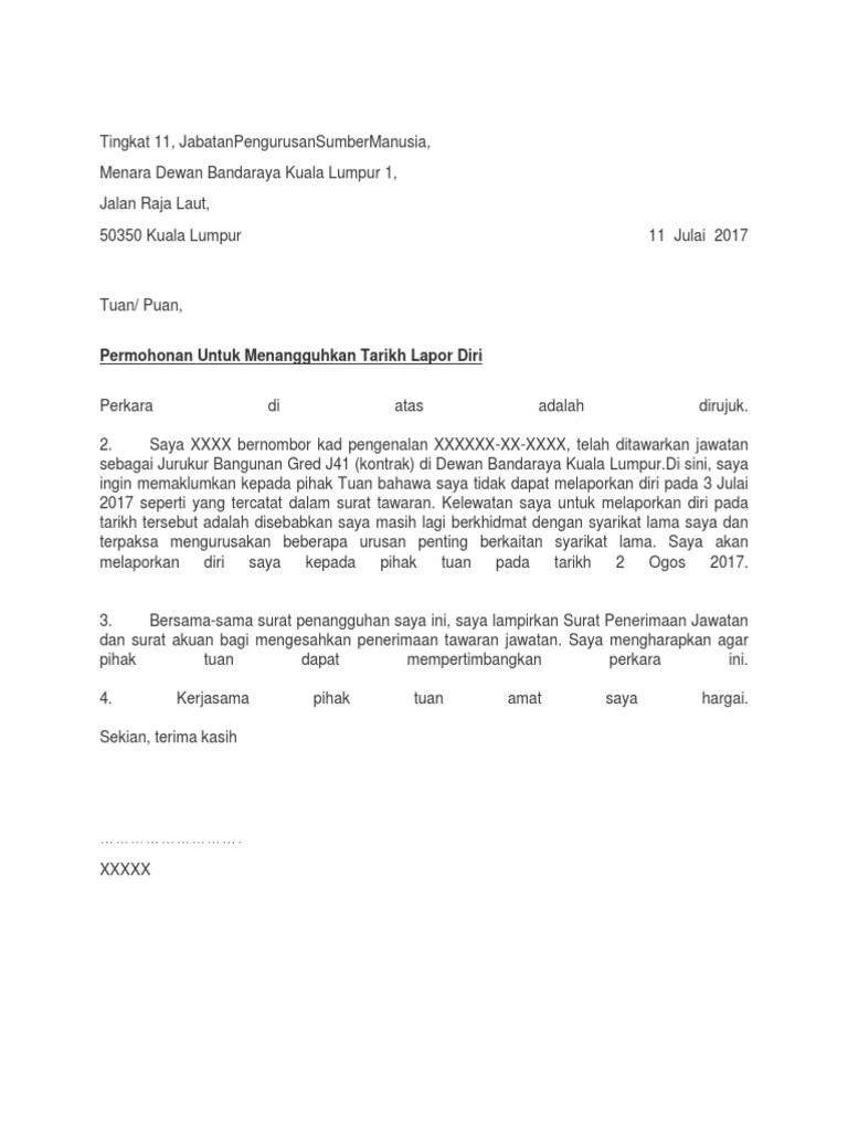 Berikut adalah contoh surat penangguhan lapor diri yang boleh anda. Borang lapor diri bertugas di klinik kesihatan. Contoh surat penangguhan lapor diri . Tidak melapor diri untuk bertugas selepas surat arahan lapor diri.